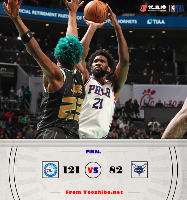 优直播3月18日讯 NBA常规赛,黄蜂今日迎战76人,前者三连败后排在东部倒数第二位,后者则是三连胜暂列东部第三位,此役马丁和马克-威廉姆斯缺战。比赛上来,两队就陷入到拉锯战,场上比分交替领先,次节前半段黄蜂依旧能够与对手保持胶着,但之后76人突然发力占据场上主动,分差也是逐渐拉开到了两位数,半场结束时黄蜂落后12分;下半场回来黄蜂直接断电,前四分钟时间里一分未得,76人趁势一波11-0的小高潮将分差扩大到二十分以上,末节上来76人再轰13-0后分差突破了三十分,比赛彻底失去悬念,最终76人大胜黄蜂迎来四连胜。