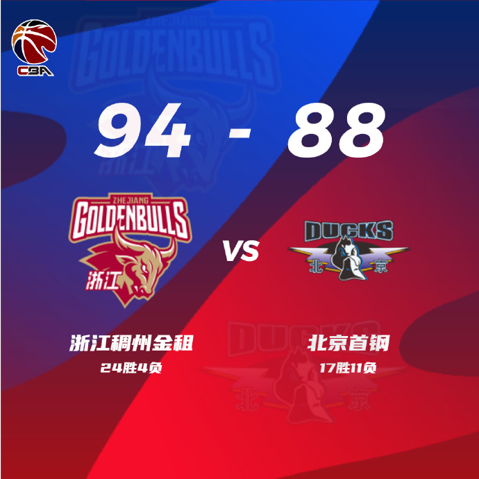 优直播1月18日讯 CBA常规赛第二阶段进入尾声,浙江对阵北京,浙江目前23胜4负高居积分榜榜首,而北京最近状态不佳,3连败后17胜10负排在第6位。上半场双方命中率并不是很高,浙江队吴前手感不佳,但好在其余队友能给予进攻端的帮助,而北京队更是不在状态,首节只拿到16分,次节依靠约翰逊的强打北京一度反超比分,但浙江迅速调整,多点开花都能得分还是稳住领先。下半场,双方进攻端终于有起色,方硕、曾凡博联手翟晓川砍下18分帮助北京直接追平比分,随后双方命中率又有回落,但是展开胶着拉锯战,浙江通过外线三分重新反超并拉开比分,吴前连续失误又给北京机会,好在摩西-赖特关键抛投打进后又快下暴扣锁定胜局,最终浙江94-88力克北京,拿到3连胜的同时送对手4连败。