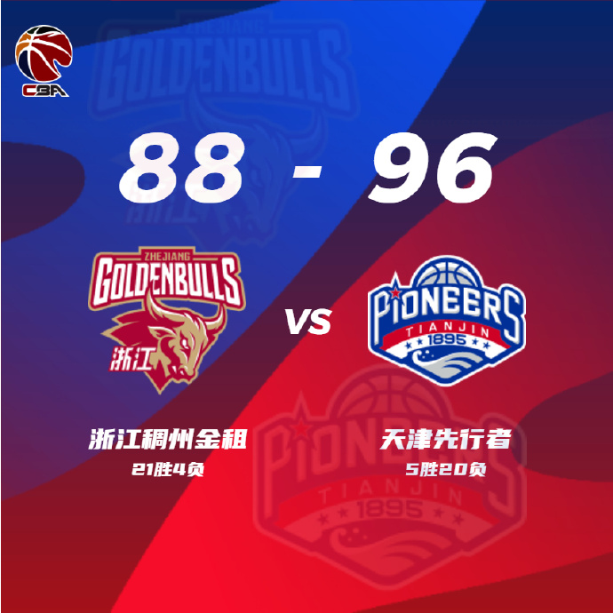 优直播1月12日讯 CBA常规赛继续进行,领头羊浙江迎战天津,天津近期遭遇四连败后战绩来到4胜20负,目前仅列联赛倒数第三,浙江迎来连胜后战绩更新为21胜3负,继续领跑全联盟。比赛一上来两队进攻稍显滞涩,中段浙江率先找到进攻状态,内外结合的他们逐渐占据上风,首节结束时浙江暂时领先9分,次节回来,天津外线手感滚烫连中三分,双方分差逐渐被缩小,吴前连续突破得手率队稳住局势,半场战罢,浙江依然保有6分优势。易边再战后场上形势风云突变,浙江进攻断电单节仅得到14分,天津延续追分势头,中段一波9-0实现反超,末段浙江进攻依然滞涩,三节结束后天津反超5分,末节上来,浙江找回手感接连追分,无奈天津总能给予回应,决胜时刻双方陷入缠斗,杰弗森飚中冷血三分,浙江追分未果,最终天津96-88力克浙江。