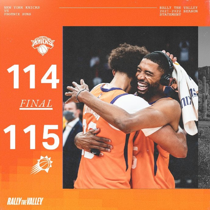 优直播3月5日讯 NBA常规赛继续进行,高居联盟第一的太阳主场迎战尼克斯,缺少布克和保罗的太阳上场大胜开拓者终结连败,而尼克斯近来遭遇六连败位列东部倒数第四,此役一上来两队手感火热陷入僵持,兰德尔予取予求首节独得14分,布里奇斯连中三分率队逐渐占优,首节结束时太阳领先2分,次节回来,两队太阳延续外线火热手感,沙梅特和约翰逊连中三分,尼克斯多点开花继续紧咬比分,半场战罢,太阳继续领先3分。易边再战后富尼耶联手兰德尔打出7-0小高潮,尼克斯一举反超,随后双方你来我往继续僵持,兰德尔与约翰逊爆发冲突,前者累积两T被驱逐,但尼克斯多点开花扩大优势,三节结束后尼克斯反超12分,末节上来,约翰逊连进三分率队打出9-0小高潮缩小分差,约翰逊手感滚烫单节轰下21分,尼克斯内外结合总能及时回应,关键时刻克劳德飚中反超三分,罗宾逊补篮打进再度反超,约翰逊最后时刻上演压哨三分绝杀,最终太阳115-114险胜尼克斯。
