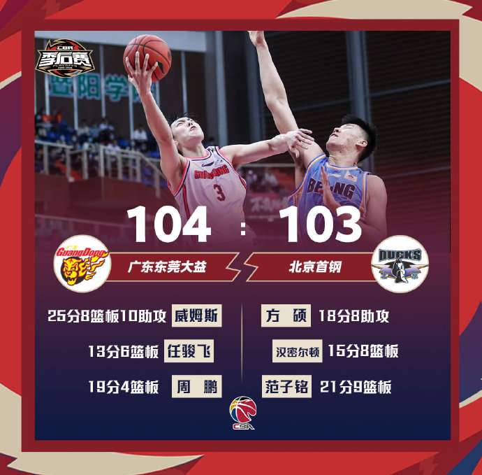 北京:范子铭21分9篮板、方硕18分3篮板8助攻、汉密尔顿15分8篮板、李慕豪4分6篮板1助攻、雷蒙12分3篮板2助攻、朱彦西11分6篮板2抢断、迈克瑞16分3篮板