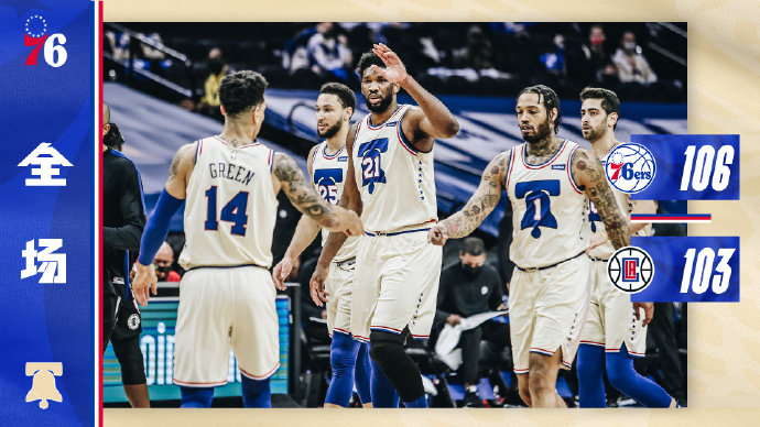 优直播4月17日讯 今日NBA常规赛,快船客场挑战76人,本场比赛乔治复出,莱昂纳德继续缺战。比赛开始,76人迅速找到进攻节奏,三分线外神准,一波15-0进攻高潮取得大比分领先,快船慢慢找到进攻感觉,但首节结束仍然落后76人11分。次节开始后,快船进攻效率依然不高,虽然一度将分差缩小至5分,但很快就被76人再次拉开差距,半场战罢,76人59-47依然保持12分领先。下半场开始后快船外线开始发力,连续命中3记三分将分差缩小至只剩3分,乔治延续上半场火热状态里突外投接连拿分,恩比德依靠内线优势替76人稳住局面,三节结束,76人只领先快船4分。最后一节,快船持续发力依靠外线火热手感将比分反超,76人依靠恩比德内线优势不断造成杀伤,雷吉最后时刻关键三分将分差缩小至1分,格林依靠罚球取分稳住局面,最终76人力克快船终结其7连胜。