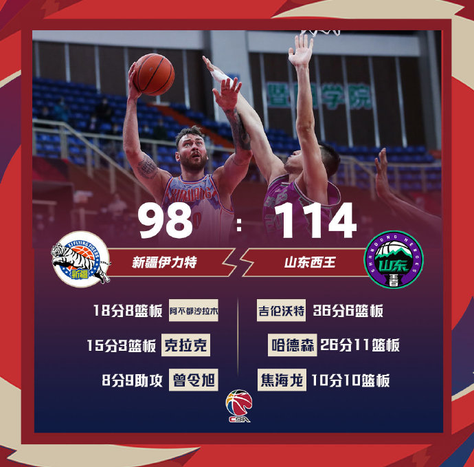优直播4月11日讯 CBA常规赛倒数第二轮,新疆与山东侠路相逢,目前新疆已经锁定常规赛第四名,山东则暂列第五,此役高诗岩因伤缺阵。首节两队均是内外结合,比分也始终紧咬,但新疆老大难的罚球问题还是让他们处于追赶者的角色,次节周琦因为身体原因被迫下场,新疆的进攻几次断电,山东则是多点开花很快就确立了两位数的领先优势。第三节山东在哈德森的带领下下起一阵三分雨,单节八记三分射得新疆晕头转向,节末一波8-0的攻击波后更是将分差扩大到24分,末节新疆一度送出10-0的攻势看到了追平的希望,但吉伦沃特单节爆砍17分彻底杀死比赛悬念,最终山东114-98击败新疆,取得三连胜的同时也送给对手三连败。