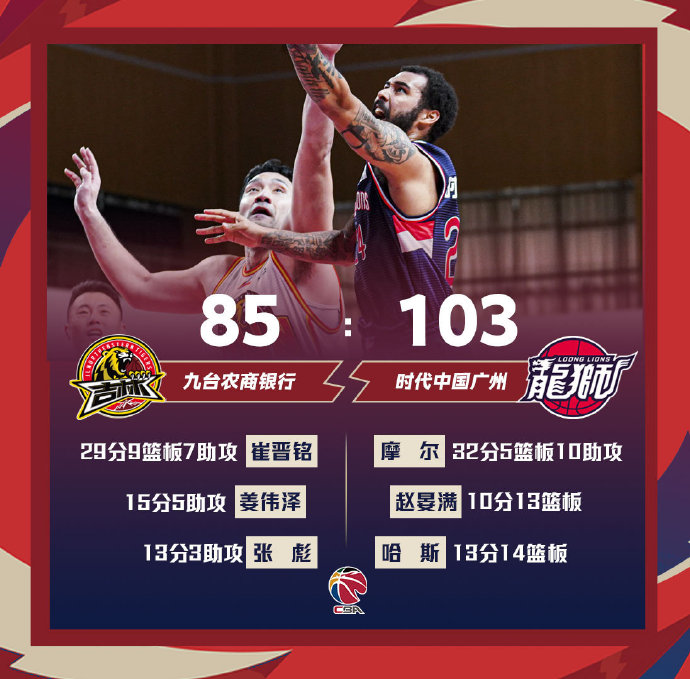 吉林(27-26):崔晋铭29分9板7助,姜伟泽15分2板5助,钟诚9分3板2助,刘天意6分3板,代怀博3分1板,张彪13分3助,耿铭旸3分2板,丁皓然6分3板,李安1分7板2助