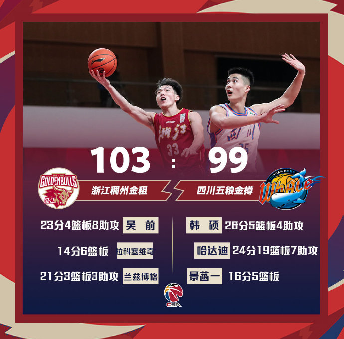 浙江(35-8):吴前23分7助攻4篮板2抢断、兰兹博格21分3篮板3助攻、拉科塞维奇14分6篮板2盖帽、赖俊豪10分9篮板4抢断2助攻2盖帽、陆文博10分、张大宇8分6篮板、王仔路8分、王奕博4分4篮板3助攻、程帅澎3分、林孝天2分2助攻