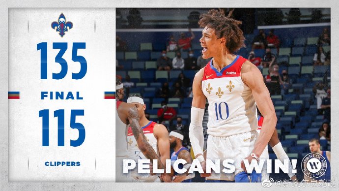 优直播3月15日讯 NBA常规赛快船客场挑战鹈鹕,开场后鲍尔在外线就展现出火热手感连中三分,鹈鹕进攻状态不错首节便建立起两位数领先。第二节上来乔治带领轮番阵容缩小分差,但随后鹈鹕也打出攻势再次拉开比分,莱昂纳德带领球队没有让比分被拉开,上半场鹈鹕67-57领先。下半场回来鹈鹕攻势又起,英格拉姆和锡安两人轮番砍分,越打越顺的鹈鹕单节轰下43分直接将比分拉开,快船第四节也无心追分,最终鹈鹕135-115大胜快船取得2连胜。
