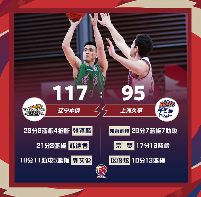 辽宁(32-3):张镇麟23分8篮板4抢断、郭艾伦18分5篮板11助攻、梅奥23分2篮板3助攻、韩德君21分8篮板2助攻、赵继伟15分4篮板3助攻8抢断、刘志轩3分、吴昌泽4分、朱荣振7分8篮板5盖帽