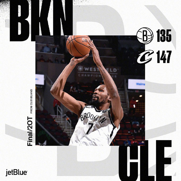 优直播1月21日讯 篮网前往客场挑战骑士,此役欧文复出,篮网三巨头首次齐登场。首节开局欧文状态火热连续得分,帮助篮网先拔头筹,可是篮网之后命中率下滑,骑士在奥斯曼的带领下回敬一波14-0反超比分。虽然篮网三巨头之后站出来轮番得分,但是骑士亦延续手感,塞克斯顿、德拉蒙德和奥斯曼频频砍分还以颜色,帮助骑士一路保持着领先。不过,篮网在末节展开疯狂反扑,杜兰特、哈登和欧文火力全开率队成功扳平比分,把比赛拖入加时。加时赛里,欧文和杜兰特连续砍分帮助篮网取得领先,但塞克斯顿在关键时刻命中三分把比赛拖入第二个加时。第二个加时塞克斯顿大爆发独中4记三分率队拉开比分,最终骑士凭借塞克斯顿的超神发挥以147-135击败篮网,终结对手4连胜。