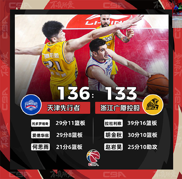优直播12月26日讯 CBA常规赛第23轮比赛继续进行,近期四连败的广厦迎战联盟垫底的天津,上轮两次技犯的胡金秋申诉成功首发出战,孙铭徽则因伤继续缺席,首节上来两队外线早早开张,赵岩昊状态火热独得12分,托多罗维奇则率队及时回应,首节结束时两队战成32平,次节比赛中托多罗维奇肆虐内线,单节独得13分的他半场结束已经轰下24分,天津带着2分优势进入中场休息。易边再战后两队继续火热对攻,爱德华兹中段连得9分,拉杜利察则单节砍下20分,三节结束时天津依然领先3分,末节回来广厦一波10-0成功反超,天津连中三分抹平分差,拉杜利察被吹违体犯规后天津连中罚球,但赵岩昊关键跳投打进,爱德华兹失误后大帽拉杜利察,两队常规时间打平进入加时。加时赛中,两队你来我往继续紧咬,爱德华兹关键时刻连续取分,广厦回天乏术,最终天津136-133险胜广厦。