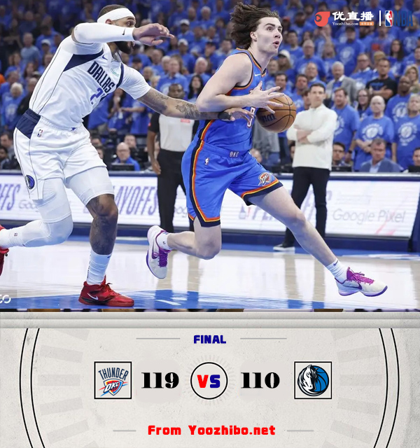 优直播讯 5月10日讯 西部半决赛今日继续开打,雷霆坐镇主场迎来和独行侠的G2之战,首战雷霆主场22分大胜独行侠先拔头筹。上一场手感不佳且三分8投1中的东契奇早早进入状态,首节他命中4记三分独得16+6,同时也有3记三分入账拿到11分的华盛顿成为奇兵协助球队取得微弱优势;雷霆方面以亚历山大和替补端的杰林为主一路紧追比分;次节东契奇遭到重点盯防更多以梳理进攻为主,反倒是华盛顿持续开火为球队守住微弱优势。雷霆这边进攻端稳定奈何就是无法限制对手,尤其整个上半场独行侠角色球员贡献颇多为球队拿到6分领先进入下半场。休息归来雷霆上来连续远投得手送上13-4的攻势一举反超比分,然而独行侠被动之下不是东契奇或欧文站出来,反倒是小哈达威末段连拿10分直接扭转局势并一度帮助球队取得14分领先;末节雷霆再送6-0追至4分,但回头东契奇在崴脚的情况下命中三分迅速稳住局面,整个第四节独行侠虽然无法彻底打垮对手但关键时刻连续拿分牢守领先。最终,独行侠客场力克雷霆拿下比赛,总比分1-1战成平手。