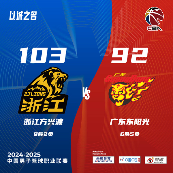 广厦(9-2):孙铭徽23分9助3断、胡金秋14分、朱俊龙13分5板、布朗25分8助、奈特7分13板、卡尔顿13分4板。