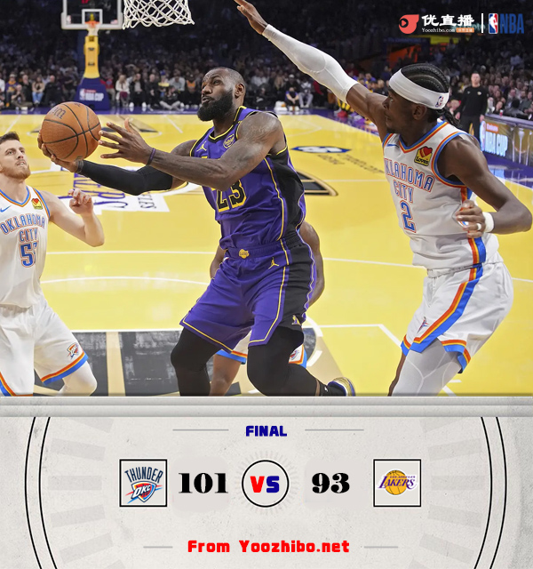 优直播讯北京时间11月30日讯 NBA杯今日继续开打,湖人和雷霆今日迎来一场争夺,这场比赛关乎于湖人能否冲击一张外卡进入淘汰赛。首节之争雷霆在亚历山大和杰威联手拿下11分的带动下反客为主取得18-8的开局领先;然而他们在首节6分钟的时间里砍下20分的情况下突然哑火各种打铁;湖人虽然慢热但在之后逐渐找到感觉,次节初一波9-2的攻势追上比分;不过面对雷霆的不断送礼,湖人也没能抓住机会,雷霆则在最后不到30秒的时间里连中两记三分并取得3分领先进入下半场。休息归来双方整体效率都不高持续拉锯,雷霆虽然大部分时间一直保持微弱优势但很难拉开比分,悬念也一直保留到最后。不过最后时刻又是亚历山大,他的关键三分加上造犯规罚球帮助雷霆拉开4分优势奠定胜局。最终,雷霆力克湖人拿下比赛。