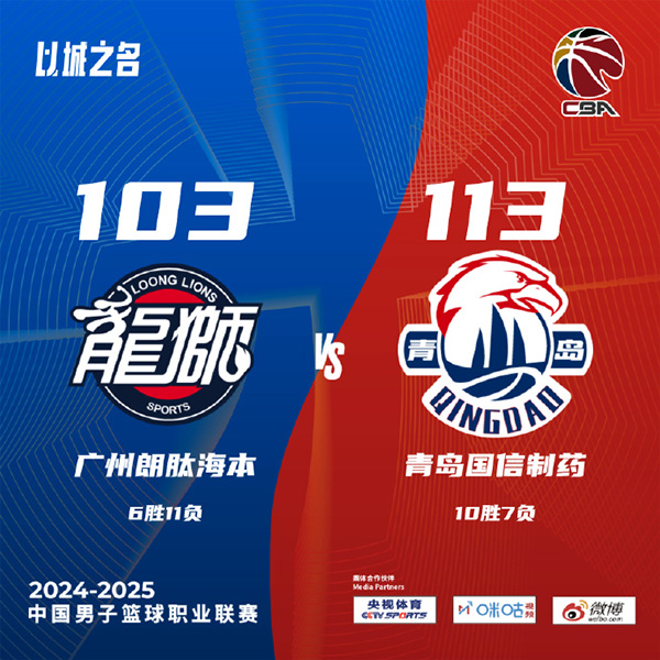 优直播讯 2024年12月14日讯 CBA常规赛,广州主场迎战青岛,广州目前6胜10负排在第15位,青岛则是9胜7负排名第10,本场比赛郭艾伦继续缺阵,丁彦雨航还未体测。比赛开始,杨瀚森攻防两端发力,赵嘉义也接连三分命中,青岛顺势取得领先,但广州双外援联手回应咬住比分,韦瑟斯庞里突外投连砍9分,首节青岛领先5分,次节米奇和韦瑟斯庞协同发力拉开双位数领先,随后青岛下起三分雨一度领先到近20分,但广州半场结束前接连3记三分回应追到差9分。下半场,双方展开拉锯战,广州依靠外援追分,韦瑟斯庞连续3记不讲理超远三分强势回应,三节青岛继续领先10分,末节双方还是外援互相对飚,分差始终保持在10分左右,韦瑟斯庞总能在关键时刻站出来回应,最终青岛113-103力克广州。