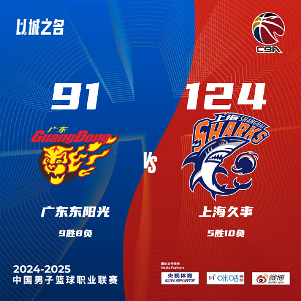 优直播讯2024年12月14日讯 CBA常规赛,广东今日迎战上海,前者近来取得两连胜,后者则是三连胜,并且三场赢了101分。比赛上来,广东率先进入状态打出7-0的完美开局,但上海此后及时调整追了回来,首节后半段广东更是陷入到得分荒,上海轰出一波11-0取得领先,次节广东的情况依旧没有好转,除了徐杰和吉伦沃特其他人难有发挥,分差也是被扩大到二十分以上,半场结束时上海领先19分;下半场回来,广东的命中率有所提升,但依旧无法限制对手的攻势,上海连续第三节单节得分破30分,分差也是一直保持在二十分左右,比赛在末节早已失去悬念,最终上海大胜广东迎来四连胜。