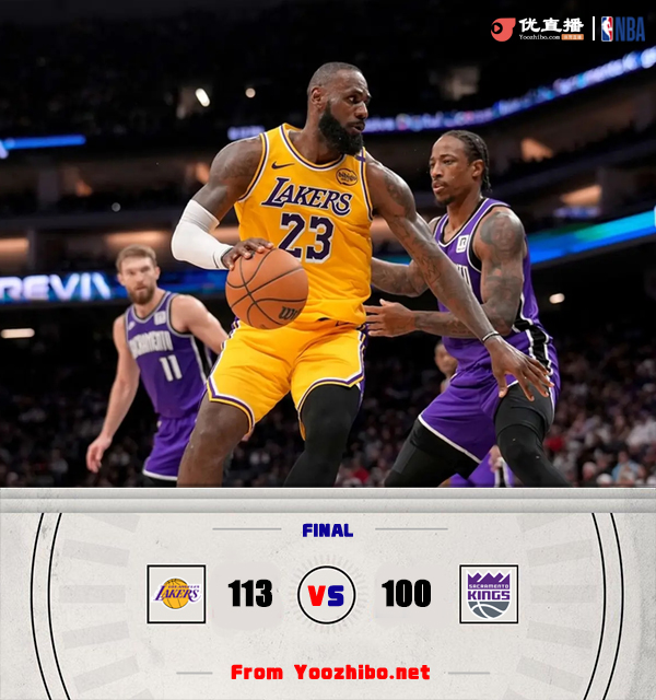 优直播讯 北京时间12月20日讯 NBA常规赛继续开打,国王今日坐镇主场迎战湖人,这是两支球队3天2战首场对决。首节之争湖人以詹姆斯连拿5分为主送出15-2的攻势反客为主抢占先机,不过他们没能把完美的状态延续下去;国王开局被对手三板斧打懵后及时止住颓势,以德罗赞为首的他们连续拿分止血,随后第二节国王彻底起势轰出26-12的攻势一举反超比,不过末段湖人及时回暖,浓眉哥的关键2+1和文森特的三分带领湖人回暖并取得4分领先进入下半场,与此同时詹姆斯在上半场完成了追平得分上双纪录和独占出场时间历史第一的两项壮举。休息归来双方持续拉锯,湖人虽然大部分时间占据上风但优势并不大,不过末节决胜时刻以里夫斯的关键三分为主,湖人送出12-2的攻势拉开两位数奠定胜局。最终,湖人击败国王拿下比赛。