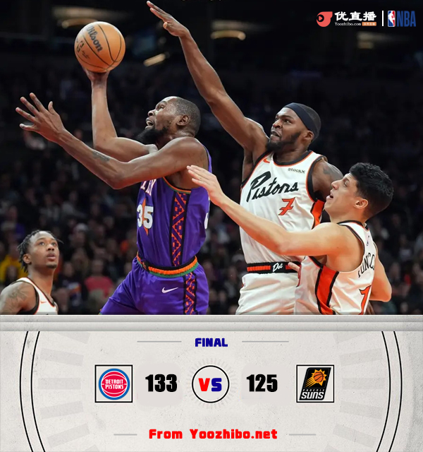 优直播讯 北京时间12月22日讯 NBA常规赛继续开打,太阳坐镇主场迎战活塞,布克本场因为腹股沟伤势缺席比赛。首节之争活塞反客为主打出完美第一节,他们在和对手短暂纠缠后迅速接管比赛,他们先是一波19-4的攻势拉开两位数领先,随后面对太阳回暖的反扑,他们最后又连续三分轰出单节41分并确立15分领先;次节活塞进攻回落而太阳不断蚕食分差,比尔分担了杜兰特身上的压力连续拿分,太阳在第二节追回10分并带着5分劣势进入下半场。第三节太阳进攻端有余防守不足,活塞单节9记三分打得他们毫无办法;末节太阳虽然能够咬住比分但始终无法扭转局势,最后读秒阶段康宁汉姆迎着杜兰特命中三分,随后杜兰特又致命失误无力回天。最终,活塞力克太阳拿下比赛。