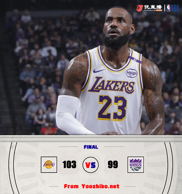 优直播讯 北京时间12月22日讯 NBA常规赛,湖人客场挑战国王。湖人近期2连胜,以15胜12负排在西部第七,国王13胜15负暂列西部倒数第四。比赛开始,詹姆斯率先发力,连突带投单节独得12分率队取得领先,福克斯连投带罚帮助国王咬住比分,次节詹姆斯依旧神挡杀神,国王内外开花努力追赶,半场战罢湖人56-53领先国王。易边再战,双方陷入拉锯战,比分交替领先,末节湖人持续发力取得10分领先,福克斯和小萨联手拿分顽强咬住,关键时刻浓眉两罚不中,但八村塁拍出前场篮板后里夫斯两罚都有,湖人103-99险胜国王。