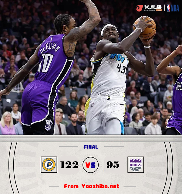 优直播12月23日 NBA常规赛,国王主场迎战步行者。国王3连败排西部第十二,步行者3连胜列东部第八。比赛开始,双方开场势均力敌,比分交替领先,次节双方依旧打得难解难分,国王内外开花,步行者不断冲击内线拿分强势回应,两队你追我赶,半场战罢战成52平。易边再战,步行者持续发力,多点开花取得两位数领先,末节国王彻底断电,步行者轰出24-7将分差拉开到20分以上杀死比赛。最终,步行者122-95轻取国王,取得4连胜的同时送给国王4连败。
