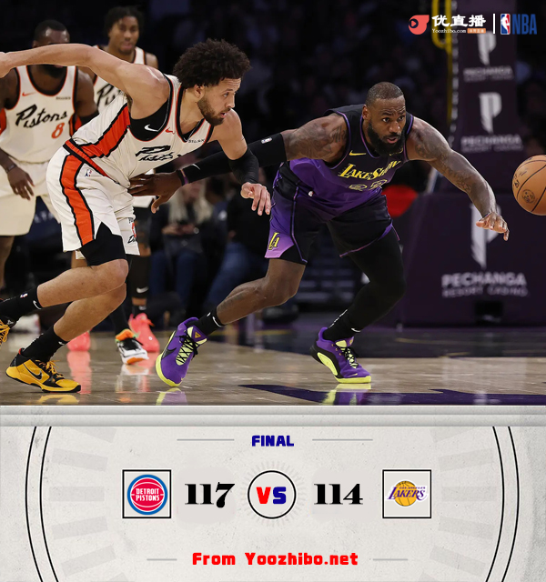 优直播讯北京时间12月24日讯NBA常规赛继续开打,湖人坐镇主场迎战活塞,湖人近期状态回暖,过去两场双杀国王后取得3连胜;活塞方面上一场击败太阳后,近期3胜2负状态同样有所回暖。首节之争双方状态都非常出色一路对攻,湖人开局稍占上风但末段让出主动权,活塞最后4分钟里命中4记三分送出16-6的攻势一举反超比分;次节剧本反转,这一次轮到活塞占据主动领先大半节时间,但最后时刻湖人连续回敬三分并夺回2分领先进入下半场。休息归来场面依旧持续拉锯,两支球队没有绝对爆点高分但命中率奇高,三节结束时双方都保持着超50%的命中率,不过末节决胜还是活塞笑到最后,湖人节中熄火直接导致败局,活塞则依靠一波7-0拉开两位数领先,詹姆斯末段连拿5分帮助球队在读秒阶段追至3分,不过最后错失扳平三分未能扳平比分。最终,活塞客场掀翻湖人拿下比赛。
