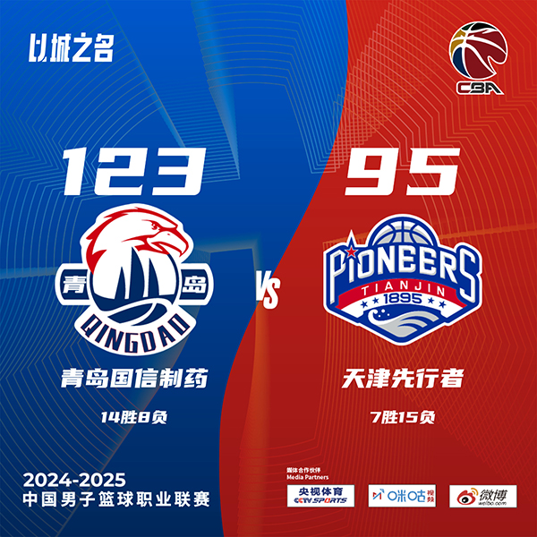 优直播讯北京时间12月25日讯 CBA常规赛,青岛主场迎战天津。青岛13胜8负排联赛第八,天津7胜14负列联赛第十四。一开场,青岛率先发力,多点开花轰出17-3的开局,大卫-詹姆斯包揽球队开场15分苦苦追赶,次节青岛牢牢占据场上主动,韦瑟斯庞高效输出带队扩大优势,半场战罢青岛65-45领先天津20分。下半场,天津里突外投拿分缩小分差,青岛多点开花稳住局势,末节青岛稳扎稳打保持优势,天津大势已去无力回天。最终,青岛123-95轻取天津,主场过关。