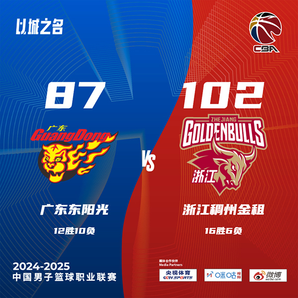 优直播讯北京时间12月25日中国男子篮球职业联赛 常规赛,广东东阳光对阵浙江稠州金租。半场广东50-52浙江,最终广东87-102浙江。广东东阳光徐杰21分3板9助,埃里克-莫兰德19分12板5助,新援莱斯登场4分钟1篮板1抢断;浙江稠州金租科比-西蒙斯24分4板5助,余嘉豪17分12板4助。