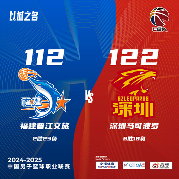 优直播讯北京时间1月3日讯 CBA常规赛,福建主场迎战深圳,福建目前2胜22负联盟垫底,深圳7胜18负排在第16位。比赛开始,黎璋霖率先发力连砍7分带队11-0小高潮建立主动权,但周鹏上篮里突外投连砍10分帮助深圳咬住比分,首节深圳仅落后1分,次节双方展开胶着拉锯战,深圳连续前场篮板一度反超,但福建接连三记三分一波12-0强势稳住局势,随后深圳4分钟内连续5记三分强势回应并在半场反超2分。下半场,贺希宁接连3记三分,深圳顺势一波进攻波拉开双位数领先,随后双方展开拉锯战,三节深圳领先到17分,末节威姆斯接连中投还能命中,周鹏外线也能提供火力,但随后深圳接连吃T,福建趁机追到个位数,威姆斯和贺希宁接连三分稳住局势,最终深圳122-112力克福建,拿到3连胜。