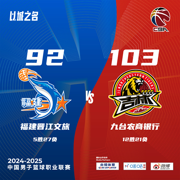 优直播讯 北京时间1月20日讯 CBA常规赛继续进行,福建主场迎战吉林,吉林近期遭遇连败,目前11胜21负暂列联赛第15位,福建上场不敌广东,5胜26负联赛垫底。此役一上来双方便陷入缠斗,约瑟夫-杨和邹阳联手取分,琼斯盘活全队强势回应,两队你来我往比分紧咬,首节结束时福建领先2分,次节回来,双方继续鏖战,路易斯-金突然发力单节贡献12分,琼斯和基兹林克接连回应,半场战罢,福建依然领先2分。短暂休整后福建一波8-0一度拉开比分,吉林及时回暖连中三分,三节结束后吉林反超1分,末节决战,福建进攻滞涩,琼斯予取予求率队奠定胜势,福建追分无望,最终吉林103-92力克对手。