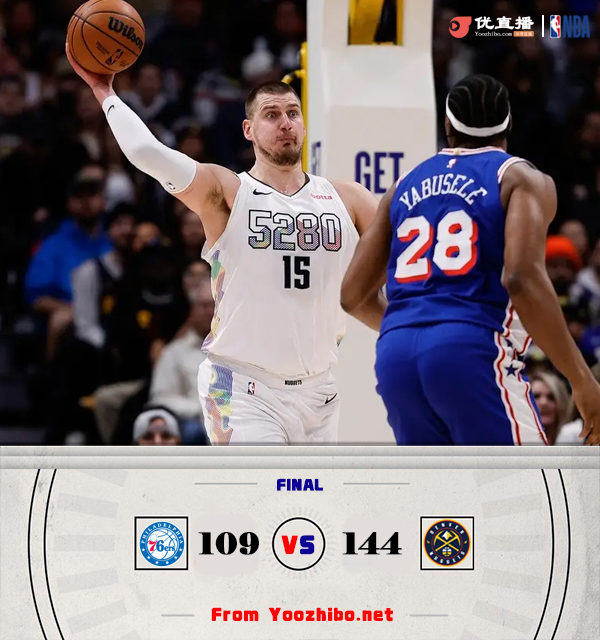 优直播讯 北京时间1月22日讯 NBA常规赛,掘金主场迎战76人。掘金26胜16负稳居西部第四,76人15胜26负排东部第十一,近期更是遭遇6连败。恩比德继续缺阵。一开场,双方短暂相持,随后掘金内外开花一举取得两位数优势,乔治三分止血,次节双方围绕10分左右分差展开拉锯战,掘金连中三分,马克西内外开花顽强咬住,半场战罢掘金77-67领先76人。下半场,掘金延续火力,多点开花将优势扩大到20分以上,末节掘金稳扎稳打,76人大势已去无力回天。最终,掘金144-109大胜76人,送给对手7连败。