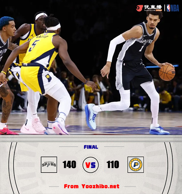 优直播讯 北京时间1月24日讯 NBA常规赛巴黎赛,马刺对阵步行者。马刺19胜22负西部第12,步行者24胜19负东部第5。一开场,双方大打对攻,比分交替领先,文班亚马里突外投高效输出,步行者多点开花给出回应,次节两队继续缠斗,步行者率先发力占据主动,马刺奋力反击夺回优势,半场战罢马刺60-57领先步行者。下半场,文班攻防两端发力,马刺持续输出单节狂轰45分,一举确立20分以上优势,末节马刺稳扎稳打保持大比分的领先,步行者换下主力投子认负。最终,马刺140-110大胜步行者。