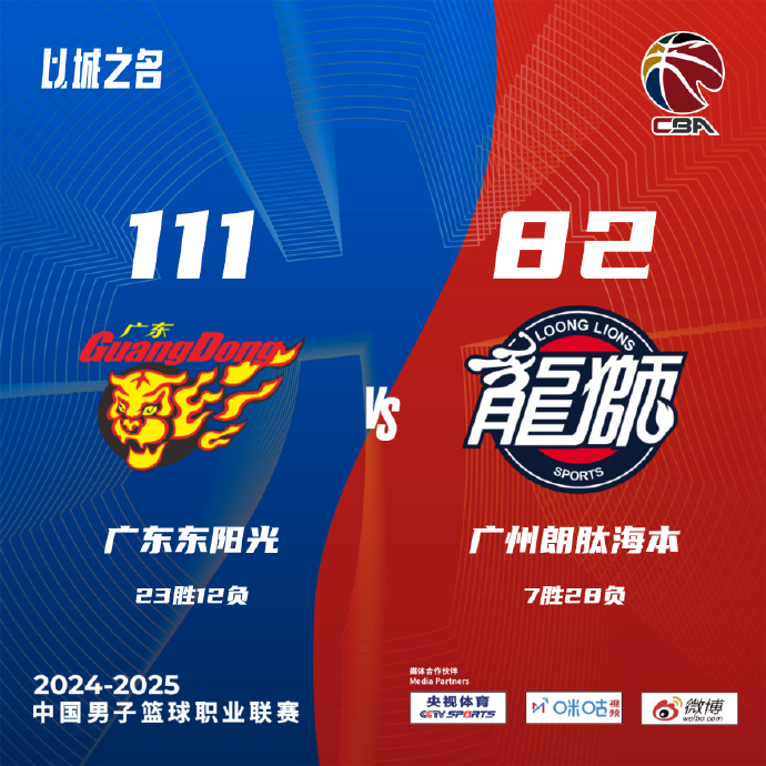 优直播1月24日讯 CBA常规赛继续进行,广东主场迎来与广州的同省德比,郭艾伦此役缺阵,广州目前遭遇6连败,7胜27负排在联赛倒数第三,广东上场不敌上海,22胜12负位列第8位。首节开打后广州反客为主一度占优,莫兰德和任骏飞内线接连打进,广东稳住局势后来居上,首节结束时广东领先7分,次节回来,双方进攻稍显滞涩,贝兹利内外结合不断取分,广东稳扎稳打始终保持优势,麦考尔单节13分苦苦支撑,半场战罢,广东已经领先10分。易边再战后广州进攻依然没有起色,吉伦沃特联手任骏飞不断拉开比分,广东领先17分进入末节,末节上来,广州率先换上全部替补,双方分差越来越大,比赛提前失去悬念,最终广东111-82大胜送对手7连败。