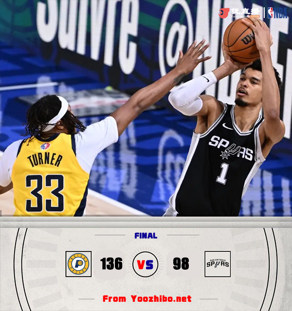 优直播讯 北京时间1月26日讯 NBA常规赛巴黎赛,马刺继续对阵步行者。马刺20胜22负排西部第12,步行者24胜20负东部第5。比赛开始,双方开场势均力敌,比分咬得很紧,步行者内外开花取得两位数优势,次节马刺不断冲击内线得手扳平比分,步行者三分3连击稳住局势,马刺突然哑火,半场战罢步行者65-50领先马刺。易边再战,马刺大举反击,文班亚马攻防两端立功带队反超,哈利伯顿挺身而出三分4连击帮助球队重获两位数优势,末节步行者攻防两端发力打出8-0的攻击波一举将分差拉开到20分以上,马刺大势已去无力回天,沃克击中西索科头部被吹一级恶犯,马穆凯拉什维利推飞布莱恩特被吹二级恶犯直接驱逐。最终,步行者136-98大胜马刺,完成复仇。