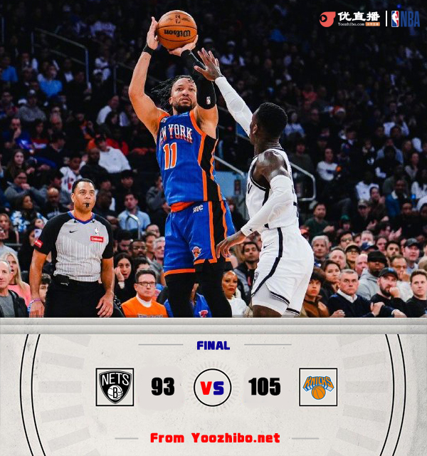 优直播3月24日讯 NBA常规赛,尼克斯主场迎战篮网。尼克斯东部第五,篮网5连败东部倒数第五。一开场,尼克斯率先发力,连中三分占据主动,篮网不断冲击内线拿分迅速反超,此后双方陷入缠斗,比分交替领先,迪文岑佐连得5分,布里奇斯超远压哨三分帮助篮网57-56领先结束上半场。第三节,两队依旧打得难解难分,比分交替领先,尼克斯一波9-0占据主动,末节迪文岑佐突然发力连得10分带队打出12-0的攻击波确立两位数优势,篮网进攻端哑火,分差越拉越大,最终,尼克斯105-93击败篮网,送给对手6连败。