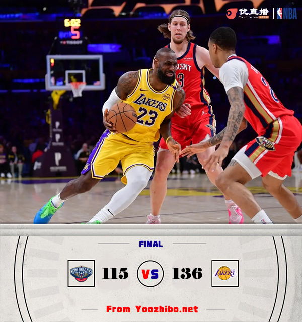 优直播3月5日讯 NBA常规赛,湖人主场迎战鹈鹕,湖人目前6连胜后38胜21负高居西部次席,鹈鹕则是17胜44负排在西部第14位。本场比赛,里夫斯、八村塁和古德温继续缺阵。比赛开始,詹姆斯通过一记三分达成50000分神迹,随后东契奇连进3记三分带队13-2攻击波拉开比分,锡安连续攻击内线止血,首节湖人领先13分,次节霍金斯接连三分追分,锡安持续冲击内线单节砍13分,鹈鹕20-7攻击波一度追平比分,詹姆斯接连三分带队回应11-0攻击波止血,海斯连续内线吃饼暴扣半场砍19分,湖人依然领先10分。下半场,双方接连突破造杀伤展开拉锯战,东契奇三分继续火热,而且接连送助攻,湖人打出16-3攻击波直接拉开20分以上领先,末节锡安继续冲击内线挡不住,但詹姆斯里突外投强势回应,分差始终保持在20分左右,最终湖人136-115轻取鹈鹕,拿到7连胜。