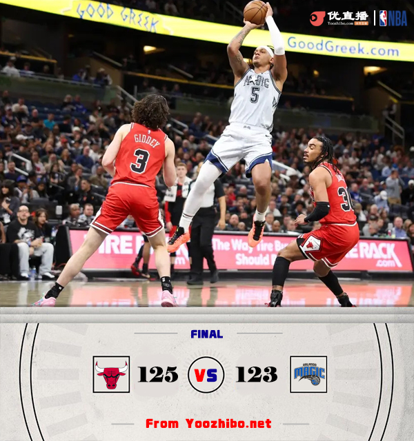 优直播讯北京时间3月7日讯 NBA常规赛,魔术主场迎战公牛。魔术4连败,以29胜34负排东部第8,公牛24胜38负东部第10。上半场,两队开场便陷入缠斗,比分始终紧咬,魔术轮番冲击内线屡屡暴扣,公牛多点开花给出回应,次节双方继续对攻,公牛全民皆兵,班凯罗连造杀伤还以颜色,半场战罢公牛69-66领先魔术3分。下半场,魔术轰出17-4一度取得两位数领先,公牛多点开花扳平比分,末节双方争夺陷入白热化,关键时刻怀特内外开花连得5分,班凯罗绝杀三分不中,公牛125-123魔术险胜过关。