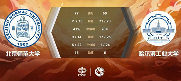 优直播讯3月12日 CUBAL东北赛区小组赛,北京师范大学对阵哈尔滨工业大学。首场小组赛,两队皆获胜。比赛开始,吴士广篮下先拿2分为北京师大开局,哈工大开局很是慢热被北京师大打出9-0开局。打了3分钟杨淳君终于为哈工大开局,周鑫也连续得分,但吴士广补篮回应,肖洋三分开和后北京师大领先到双位数。周鑫三分再止血,吴士广继续二次进攻打成,首节北京师大26-12领先哈工大。次节上来,哈工大进攻端还是不在状态,北京师大顺势扩大领先。辛泽林造杀伤终于打破僵局,但两队进攻端命中率都不高,场上频频打铁。随后高梓淇接连三分命中帮助北京师大稳住领先优势,杨淳君连续前场篮板终于打成二次进攻拿到运动战进球得分,半场北京师大43-26继续领先哈工大。易边再战,双方连续几回合尝试三分但都没有命中,打了3分多钟各自仅得2分。杨淳君冲击造杀伤、强打2+1带队追分,北京师大及时调整,邵振恒站出来连续抢到前场篮板,里突外投三分也开和砍下7分强势回应。哈工大还是依靠拼抢前场篮板获得进攻机会,连续罚球追分,但三节北京师大57-46还领先哈工大11分。末节决战,双方上来又是连续打铁,邵振恒连攻加传帮助北京师大牢牢掌握住十几分领先。江龙接连打成二次进攻止血,但肖洋三分被犯规后三罚全中再回应,随后肖洋里突外投再连得6分杀死比赛,最终北京师大77-60战胜哈工大。