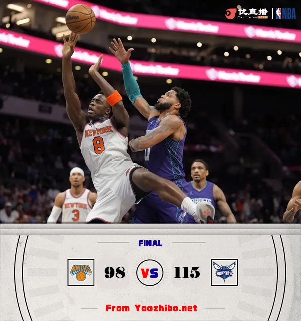 优直播讯北京时间3月21日讯 NBA常规赛,尼克斯客场挑战黄蜂。尼克斯43胜25负高居东部第3,黄蜂17胜51负东部倒数第2。上半场,黄蜂率先发力打出9-2的开局,尼克斯内外开花反超比分, 黄蜂一波8-0稳住局势,次节双方围绕10分分差展开拉锯战,尼克斯不断冲击内线,黄蜂连投带罚强势回应,半场战罢尼克斯44-54落后黄蜂。下半场,黄蜂内外开花牢牢占据场上主动,尼克斯里突外投顽强追赶,末节两队继续围绕两位数的分差展开激烈争夺,黄蜂持续发力扩大优势,马威攻防两端建功,锡伯杜在比赛还剩2分钟时换下主力投子认负。最终,尼克斯98-115不敌黄蜂,客场落败。