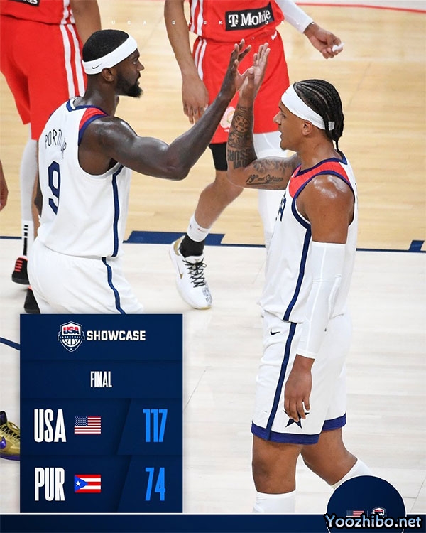 优直播8月8日讯 男篮世界杯开战在即,热身赛美国男篮对阵波多黎各男篮,美国男篮12人大名单分别为哈特、莺歌、波蒂斯、JJJ、布伦森、布里奇斯、C-约翰逊、哈利伯顿、爱德华兹、里夫斯、班凯罗和凯斯勒。比赛开始,波多黎各男篮打得很主动,美国男篮慢热之后接连攻击内线一波8-2小高潮反超比分,里夫斯上来连续中远投拿到5分拉开比分,沃特斯站出来帮助波多黎各追到差6分。次节波多黎各接连扔进三分一度追平比分,但美国男篮依靠身体优势,接连打出反击暴扣还是能保持住领先优势,半场美国男篮领先7分。下半场,双方展开拉锯战,美国男篮依靠自己的突破和断球反击重新保持双位数领先,爱德华兹里突外投连拿9分,美国男篮一波10-0在三节结束时领先至23分。末节,美国男篮上来又一波10-0直接拉开30分以上的领先,随后美国男篮越打越轻松拉开40分以上的分差,最终美国男篮117-74大胜波多黎各。
