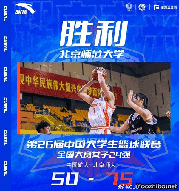 优直播讯 6月11日讯 CUBAL全国大赛女子组,北京师大对阵中国矿大。一开场,北京师大率先发力,连投带罚打出6-0的开局,王珍替补登场上篮破荒,北京师大连中三分将分差拉开到两位数,张笑连续补篮得手独得7分帮助球队扩大优势,首节结束北京师大21-6大比分领先中国矿大。第二节,两队围绕15分的分差展开拉锯战,北京师大强攻内线,中国矿大连投带罚,李欣彤三分穿针,李青阳2+1迅速回应,北京师大持续发力扩大优势,中国矿大不断冲击篮筐苦苦支撑,半场战罢北京师大38-24领先。下半场,双方经历了3分多钟的得分荒,张茂反击上篮打破僵局,赵晟初飙中三分,北京师大频频杀入内线连中三球将分差拉开到20分以上,刘晓君三分止血,中国矿大连投带罚稍稍缩小分差,三节打完北京师大50-34握有16分优势。第四节,北京师大进攻回暖,内外开花打出11-2的攻击波再度将分差拉开到20分以上,中国矿大连续打铁失误,北京师大持续发力将优势扩大到30分以上,最终,北京师大75-50大胜中国矿大。