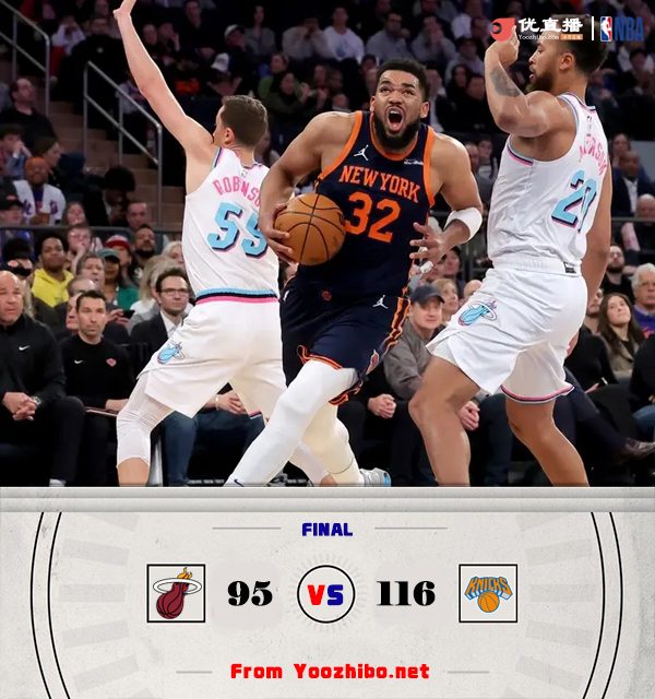 优直播讯北京时间3月18日 NBA常规赛激战正酣,热火和尼克斯两支东部球队正面对话,热火目前苦吞7连败,29胜38负排在东部第9位,尼克斯42胜24负稳居东部第三。首节开打后热火反客为主,邓肯-罗伯逊里突外投率队轰出12-0开局,布里奇斯连投带罚稍稍止血,但希罗续上火力,首节结束时热火确立11分优势,次节回来,唐斯突然爆发单节贡献15分,尼克斯一波15-2一度反超,末段两队你来我往陷入僵持,半场战罢,热火依然领先2分。易边再战后热火进攻再度停滞单节仅得到15分,尼克斯顺势反超扩大优势,三节结束后尼克斯已经领先24分,末节上来,热火无法打出追分高潮,比赛提前失去悬念,最终尼克斯116-95大胜送热火8连