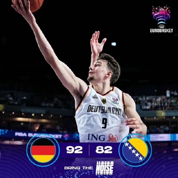优直播9月3日讯 在今天结束的一场欧锦赛B组的小组赛中,德国92-82逆转击败波黑,取得两连胜。半场结束时,波黑47-42暂时领先德国。比赛来到第三节,德国单节打出28-11,顺利逆转局势。最终,德国依靠末节的稳定发挥获得了比赛胜利。