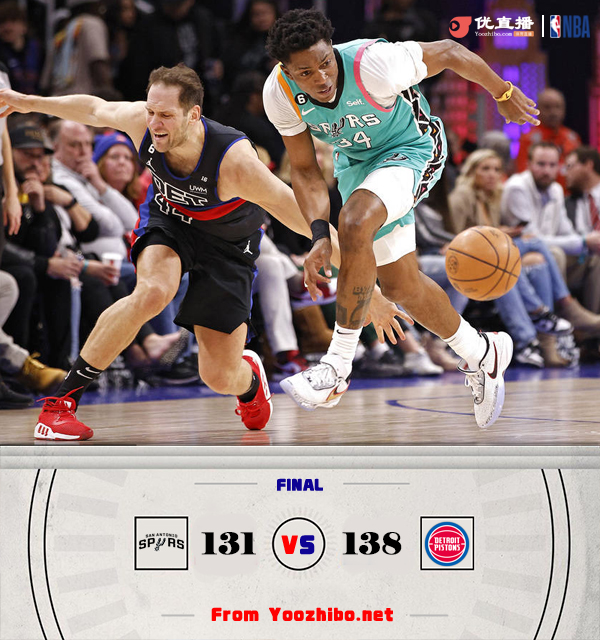 优直播2月11日讯 活塞今日坐镇主场迎战马刺,两支球队本赛季状态都很糟糕,活塞目前3连败排在东部倒数第一,而马刺则吃到10连败排在西部倒数第二。首节对决马刺客场作战但状态更优,节中一波12-5的攻势帮助他们占据上风并在末段一度拉开至两位数领先;次节马刺连续打三分得手分差一度拉大至半场最大的16分,不过活塞在这之后迎来反弹,他们突然找回手感回敬一波25-9的攻势一举抹平比分,马刺靠着科林斯最后的进球才重新取得1分领先进入下半场。休息归来活塞和马刺短暂拉锯中再度占据上风,他们不断冲击篮下送出12-2的攻势一举拉开比分;随后的马刺虽然被动但迎来奇兵,格拉汉姆最后时刻连续飙进三分帮助球队扳平比分比赛也被拖入加时。双方激战了两个加时才分出胜负,活塞最后时刻抓住机会送出7-0的攻势为球队收下比赛。最终,活塞双加时力克马刺并送后者11连败。