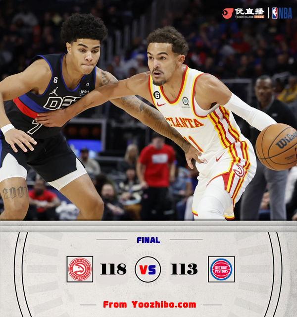 优直播讯10月27日讯 NBA常规赛老鹰对阵活塞,老鹰上场比赛不敌黄蜂遭遇赛季首败,活塞则是最近遭遇3连败。上半场老鹰靠着亨特和特雷-杨两人的发挥取得领先,康宁汉姆状态不错联手博格达诺维奇努力追分,第二节老鹰手感有所下降,活塞在康宁汉姆的带领下迫近比分,上半场老鹰只领先1分。下半场回来活塞一度完成反超,但老鹰及时调整在特雷-杨的带领下夺回领先,最终老鹰118-113力克活塞。