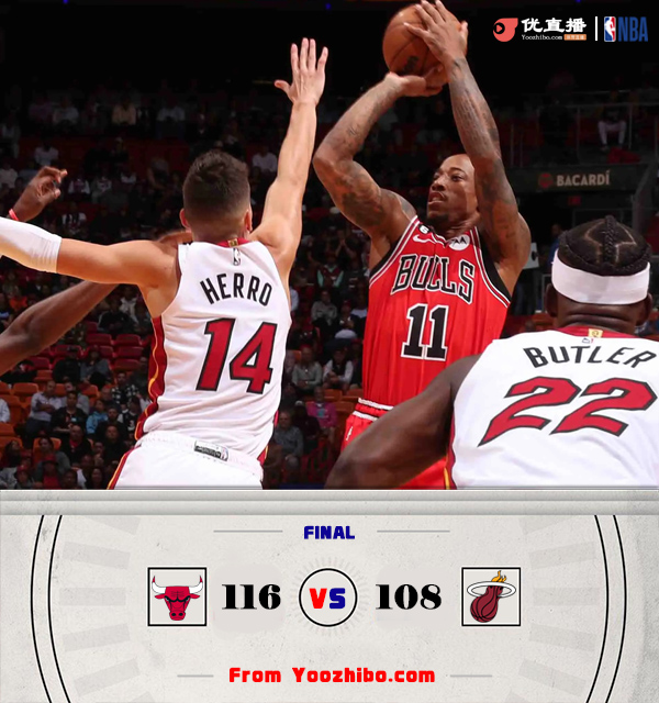 优直播10月20日讯 热火今日坐镇主场迎战自己新赛季的首个对手公牛,热火方面除了受困肌腱炎的奥拉迪波外核心阵容基本全员可以出战;公牛这边则连续遭到打击,除了鲍尔以外,拉文因为膝盖问题也缺席了本场比赛。热火在面对阵容不整的公牛只打了一节好球,公牛虽然缺少了拉文和鲍尔等核心主力,但以德拉季奇和道苏姆为首的他们在第二节轰进7记三分改写开局不利局面。下半场成为德罗赞的表演时间,第三节他疯狂砍下19分,第四节也有9分入账帮助公牛守住胜利。最终,公牛客场扑灭热火迎来开门红。
