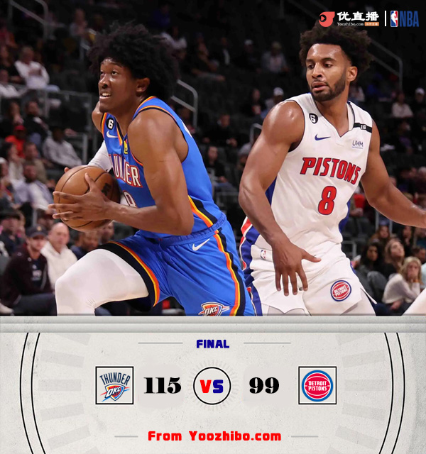 优直播 10月12日讯 NBA季前赛今日继续,活塞迎战雷霆。两队新赛季都将继续以锻炼新人为主。一开场,雷霆连中三分,活塞内外开花给出回应。巴格利伤退,活塞三分4连击领先4分结束首节。次节上来,双方依旧打得难解难分,比分交替领先,双方互送进攻高潮,活塞半场结束时57-54领先3分。易边再战,雷霆连续打出进攻高潮取得两位数优势,活塞顽强追赶,三节打完雷霆反超8分。第四节,雷霆持续发力将分差拉开到20分,活塞大势已去无力回天。最终,雷霆115-99击败活塞,取得胜利。