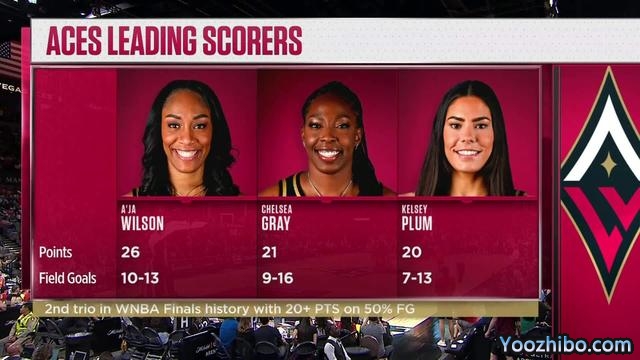 王牌队:阿贾-威尔逊26分10篮板、普拉姆20分7助攻、切尔西-格雷21分8助攻。