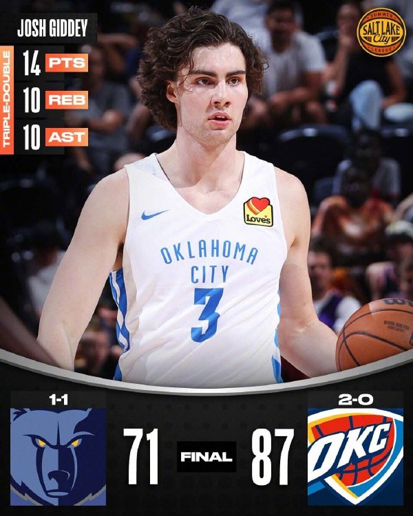优直播讯 7月7日讯 NBA犹他夏季联赛继续进行,雷霆对阵灰熊。昨天的比赛里,新科榜眼霍姆格伦的首秀非常精彩,他也带队大获全胜,灰熊则是全民皆兵险胜76人。一开场,灰熊连中三分取得领先,雷霆内外开花打出11-0的攻击波后灰熊回敬10-2的小高潮,双方20平结束首节。次节上来,雷霆多点开花取得领先,灰熊一波9-2一度反超,基迪和霍姆格伦联手拿到10分帮助雷霆以48-43领先结束上半场。易边再战,雷霆牢牢占据场上主动,再度轰出10-0的攻击波,三节打完雷霆领先15分。第四节,灰熊展开反击努力缩小分差,基迪带队稳住局势并将优势保持到了最后,最终,雷霆轻取灰熊,取得2连胜。