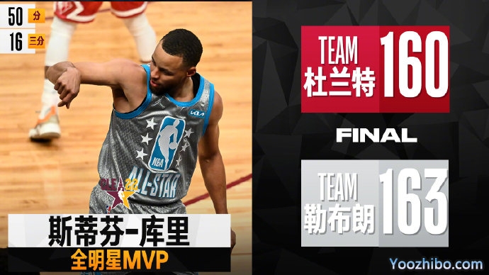 优直播 2月21日讯 在结束新秀挑战赛和各项单项争夺后,杜兰特队和詹姆斯队的全明星正赛大餐正式开启,今年正赛规则和去年一致,前三节累计总得分中,分数更高的一方加上24分为目标分数,率先得到目标分数一方为获胜方。首节争夺杜兰特队主攻内线上演各种暴力扣篮,詹姆斯队则外线手风更顺命中7记三分,东契奇最后时刻连中两记三分帮助球队以2分优势赢下首节争夺。次节两队防守强度稍稍加强但进攻端不乏精彩,库里这一节独中6记三分砍下18分,不过最终仍然还是杜兰特队笑到最后赢下第二节对决,上半场两队各赢一节,总分上杜兰特1分领先。第三节库里延续神准三分,他这一节再度轰进7记三分,不过杜兰特队整体发挥更稳,这一节打成平手的情况下总比分领先1分。末节目标比分为163分,双方这一节交替拿分分差不大悬念也一直留到最后,不过詹姆斯最后跳投杀死比赛。最终,詹姆斯队力克杜兰特队拿下比赛,而投进16记三分的库里荣膺本届全明星MVP。