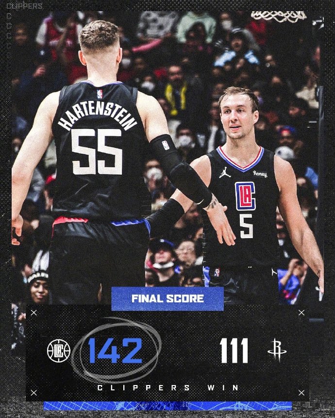快船(30-31):小莫里斯27分5篮板3助攻,肯纳德25分3助攻2抢断,祖巴茨13分10篮板,曼恩20分8篮板,雷吉12分3篮板14助攻,科菲13分2篮板4助攻,哈尔滕斯泰因13分8篮板2助攻3抢断5封盖,巴图姆3分4篮板3助攻,考文顿2分5篮板,波士顿7分2篮板2助攻2抢断,奥杰莱7分2篮板