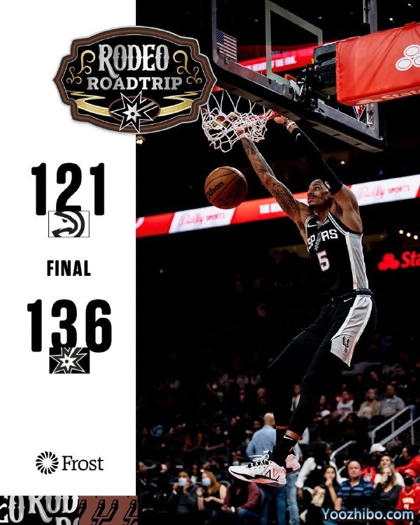 优直播2月12日讯 NBA常规赛继续进行,老鹰坐镇主场迎战马刺队,此役马刺新援理查德森等人缺阵。首节开战,马刺进攻端状态火热,全队本节外线手感出色,三分十投八中,也使球队很快建立了领先优势,节末老鹰连续两记三分稍稍迫近比分,马刺43-29领先结束第一节。次节上来,马刺外线机会变少,两队连续在内线做文章,老鹰逐渐缩小分差,一度只落后6分,但突然又陷入得分荒,马刺顺势打出8-0重新稳住局面,节末,马刺再接连命中三分,珀尔特尔超远压哨三分也中,马刺73-56保持领先结束上半场。易边再战,马刺前半节延续上半场进攻状态,逐渐拉大分差,一度领先至26分,但随后进攻突然断电,老鹰很快打出一波11-0迫近分差,节末穆雷连得四分稳住局面,三节结束马刺103-87领先。末节上来,两队交替取分,老鹰无法防住马刺的进攻迫近分差,随着约翰逊再连得五分,老鹰换上替补,马刺随后也换人,比赛进入垃圾时间,最终全场结束,马刺136-121客场大胜老鹰。