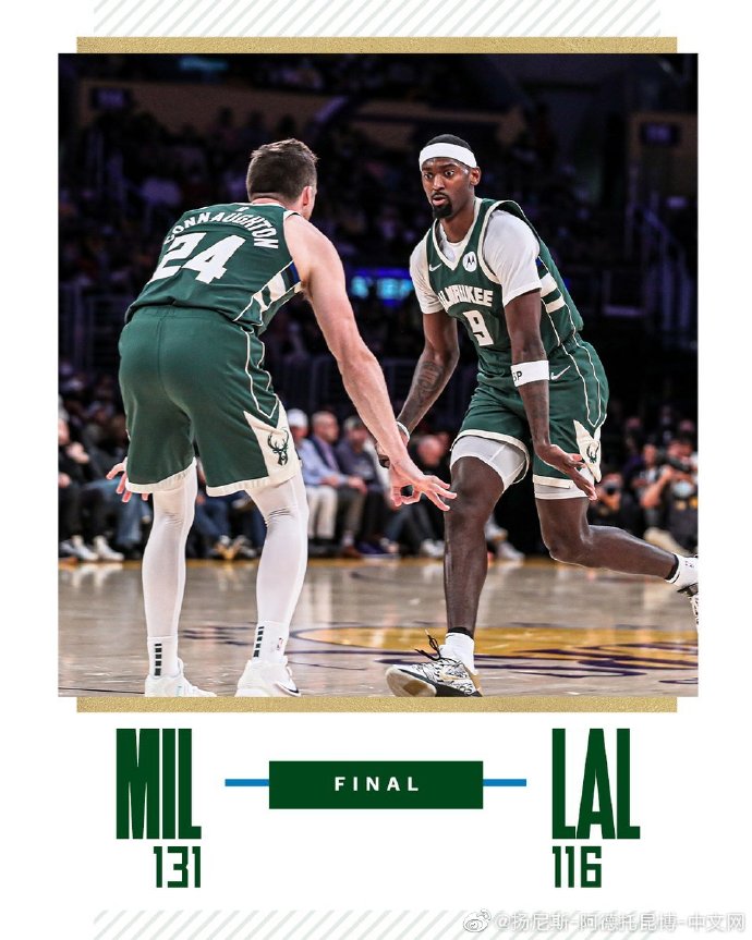 优直播2月9日讯 NBA常规赛继续进行,湖人主场迎战雄鹿,詹姆斯复出后,湖人上一场逆转尼克斯拿到很关键的一场胜利,雄鹿最近状态也正佳拿到一波3连胜。首节湖人上来连中4记三分开局,但雄鹿也是在字母哥的带领下连续攻击内线回应,湖人连续失误后被雄鹿抓住机会通过三分和反击直接建立双位数领先优势,次节雄鹿越打越好,米德尔顿出色的外线手感帮助雄鹿拉开至20分以上分差,湖人进攻端则全员不在状态,反观雄鹿多点开花半场领先到22分。第三节,雄鹿进攻端持续施压,接连的外线三分帮助雄鹿拉开至30分的分差,湖人仿佛被打没了心气,虽然能打出小高潮止血,但雄鹿还能稳住24分领先,末节詹姆斯连续强打试图掀起反攻,但字母哥都能内线强打回应,中段湖人打出12-1进攻波将分差追至10分,但雄鹿里突外投始终稳住十几分优势,最终雄鹿力克湖人,拿到4连胜。